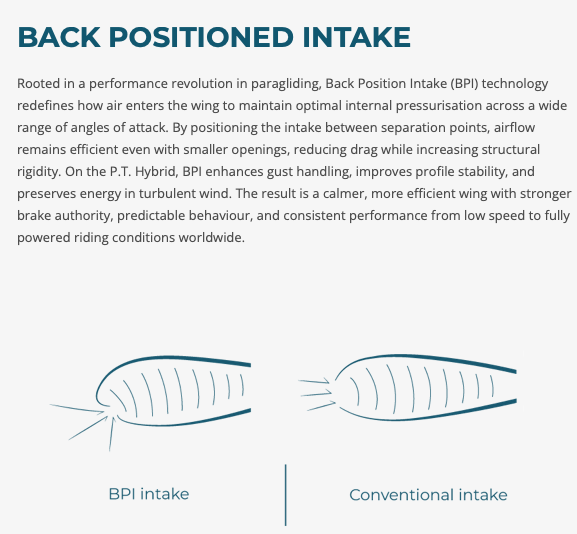 Rooted in a performance revolution in paragliding, Back Position Intake (BPI) technology redefines how air enters the wing to maintain optimal internal pressurisation across a wide range of angles of attack. By positioning the intake between separation points, airflow remains efficient even with smaller openings, reducing drag while increasing structural rigidity. On the P.T. Hybrid, BPI enhances gust handling, improves profile stability, and preserves energy in turbulent wind. The result is a calmer, more efficient wing with stronger brake authority, predictable behaviour, and consistent performance from low speed to fully powered riding conditions worldwide.