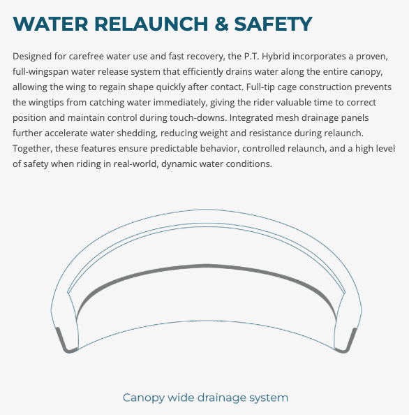 Designed for carefree water use and fast recovery, the P.T. Hybrid incorporates a proven, full-wingspan water release system that efficiently drains water along the entire canopy, allowing the wing to regain shape quickly after contact. Full-tip cage construction prevents the wingtips from catching water immediately, giving the rider valuable time to correct position and maintain control during touch-downs. Integrated mesh drainage panels further accelerate water shedding, reducing weight and resistance during relaunch. Together, these features ensure predictable behavior, controlled relaunch, and a high level of safety when riding in real-world, dynamic water conditions.
