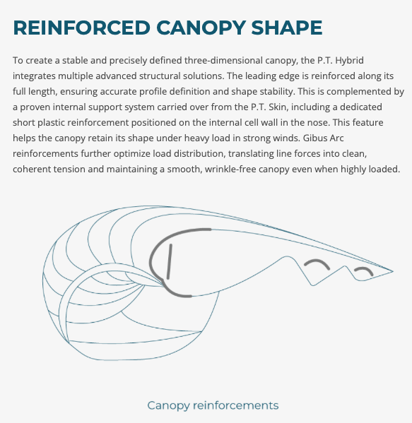 To create a stable and precisely defined three-dimensional canopy, the P.T. Hybrid integrates multiple advanced structural solutions. The leading edge is reinforced along its full length, ensuring accurate profile definition and shape stability. This is complemented by a proven internal support system carried over from the P.T. Skin, including a dedicated short plastic reinforcement positioned on the internal cell wall in the nose. This feature helps the canopy retain its shape under heavy load in strong winds. Gibus Arc reinforcements further optimize load distribution, translating line forces into clean, coherent tension and maintaining a smooth, wrinkle-free canopy even when highly loaded.