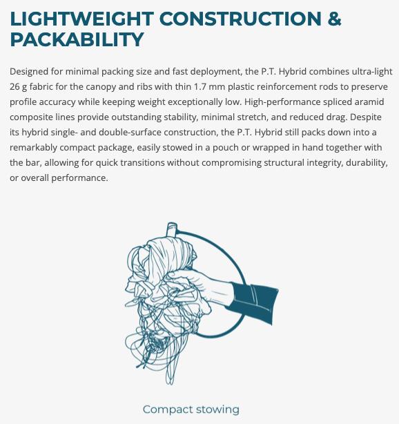 Designed for minimal packing size and fast deployment, the P.T. Hybrid combines ultra-light 26 g fabric for the canopy and ribs with thin 1.7 mm plastic reinforcement rods to preserve profile accuracy while keeping weight exceptionally low. High-performance spliced aramid composite lines provide outstanding stability, minimal stretch, and reduced drag. Despite its hybrid single- and double-surface construction, the P.T. Hybrid still packs down into a remarkably compact package, easily stowed in a pouch or wrapped in hand together with the bar, allowing for quick transitions without compromising structural integrity, durability, or overall performance.