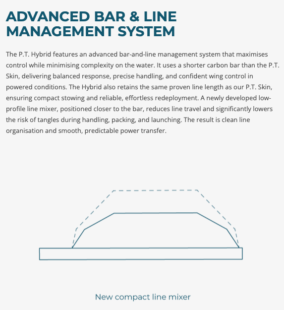The P.T. Hybrid features an advanced bar-and-line management system that maximises control while minimising complexity on the water. It uses a shorter carbon bar than the P.T. Skin, delivering balanced response, precise handling, and confident wing control in powered conditions. The Hybrid also retains the same proven line length as our P.T. Skin, ensuring compact stowing and reliable, effortless redeployment. A newly developed low-profile line mixer, positioned closer to the bar, reduces line travel and significantly lowers the risk of tangles during handling, packing, and launching. The result is clean line organisation and smooth, predictable power transfer.